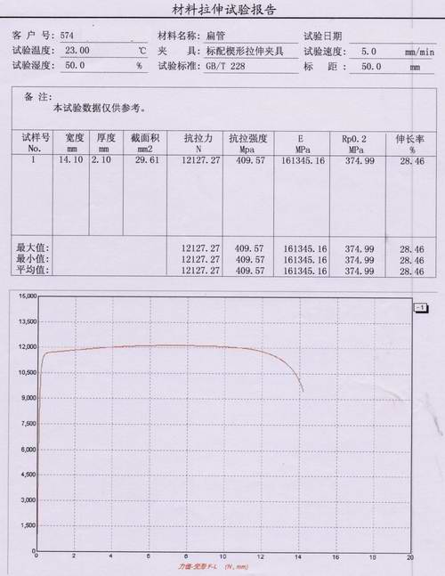 鋼管(guǎn)扁管報告內容:①試樣尺寸 ②截麵積 ③抗拉力 ④ 抗拉強度 ⑤彈性模量(E) ⑥Rp0.2 ⑦伸長(zhǎng)率