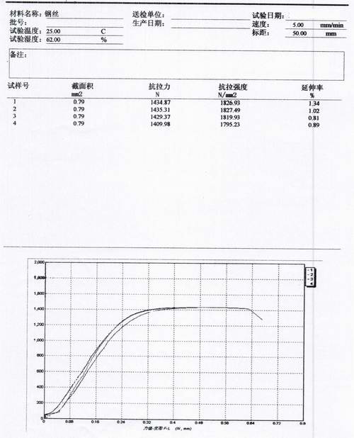 鋼絲(鋼線(xiàn))力學性能的測試報告內容:①截麵積 ②抗拉力 ③抗拉強度 ④延伸率