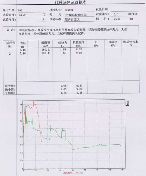 同軸(zhóu)線拉伸試驗報告內容(róng):①截麵積 ②抗拉力 ③抗拉強度 ④E ⑤Rp0.2 ⑥斷後伸長率